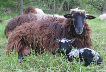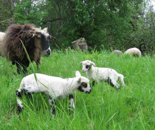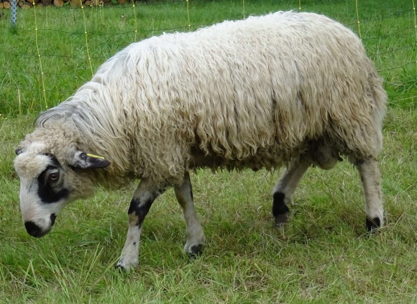 Alle vier Rassegruppen stehen heute auf der „Roten Liste“ der gefährdeten Haustierrassen, wobei das Krainer Steinschaf und das Montafoner Steinschaf die am ursprünglichsten erhaltenen Rassen sind. Ein deutliches Kennzeichen dafür sind die kleinen waagerecht stehenden Ohren und das gerade, feine Nasenprofil dieser Tiere. Ein DNA-Vergleich der Universität Gießen konnte vor etwa 20 Jahren bei einer Untersuchung von Krainer Steinschafen des Zuchtbetriebes der Familie Rist/ Allgäu belegen, dass diese Tiere einer gemeinsamen Mutterlinie mit die Torfschafen der Jungsteinzeit angehören. Unserer ersten Zuchttiere stammen von Christian Rist, einem engagierten Züchter der ersten Stunde. So zum Beispiel Lilly auf dem Foto nebenan - hier mit der etwa 3 Stunden alten Lara. Auch die "Wilde Hilde" geht auf Christians Zucht zurück. Beschreibung: Das Krainer Steinschaf ist relativ klein und zierlich. Weibliche Tiere wiegen zwischen 35 und 50 kg, Widder der alten Blutlinien etwa 50-60 kg. Typisch ist eine gerades bis leicht gebogenes Nasenbein und die waagerecht stehenden Ohren. Beide Geschlechter gibt es hornlos und behornt. Die Beine sind dünn aber stabil, die Klauen hart und gesund. Das Wollvlies ist mischwollig in allen Farbschlägen und –mischungen. Die Wolle hat sehr gute Filzeigenschaften und wird auch in unserem Wollprojekt verarbeitet. Will man die Wolle zum Handspinnen benutzen, muss gut sortiert werden. Eine wunderbar lebendige Farbenvielfalt belohnt die Mühe. Das Krainer Steinschaf wurde früher als Mehrnutzungsrasse gemolken und hat auch heute noch eine hohe Milchleistung. Mit dem Ostfriesischen Milchschaf ist das nicht vergleichbar, doch wiegen die Krainer Steinschafe auch nur etwa die Hälfte und sind gerade in Höhenlagen deutlich robuster. Krainer Steinschafe haben eine a-saisonale Brunst und beste Muttereigenschaften. Inzwischen wird das Krainer Steinschaf auch als das Milchschaf der Alpen bezeichnet und erfreut sich steigender Beliebtheit bei Selbstversorgern und Selbstvermarktern. Wiederbelebung Nur wenige Hundert Krainer Steinschafe konnten reinrassig im Gebiet des Triglav Nationalparks (Slowenien) überleben. Dort wurden und werden sie als Milchschaf zur Milch- und Käsegewinnung genutzt. In den 80er Jahren wurde verstärkt das Ostfriesische Milchschaf (OFM) eingekreuzt, um die Milchleistung zu erhöhen. Bei der konsequenten Umsetzung dieses Zuchtzieles wäre die Rasse verloren gewesen. In einer Rettungsaktion wurden 2 x je 30 Tiere mit ursprünglicher Genetik aus dem abgelegenen Trentarka Tal nach Bayern gebracht. Im Allgäu fanden sie eine neue Heimat. Dort war lange der Schwerpunkt der Krainer Steinschafzucht in Deutschland. Immer öfter findet man die Krainer Steinschafe nun aber auch in Baden-Wüttemberg und den nördlicheren Bundesländern. Die damals importieren Tiere haben diese Blutlinien begründet: B, F, K, L, M, N, R, S Damit wird nach alter Sitte jedoch immer nur die Blutlinie der väterlichen Seite benannt. Jedes Tier hat auch 50% mütterliche Genetik. Man sollte in der Erhaltungszucht die Pedigrees beider Seiten genau studieren. Auch in Slowenien hat sich der Bestand erfreulich stabilisiert. Da der Versuch OFM einzukreuzen sich nicht so sehr bewährt hatte, trifft man heute im Triglav Nationalpark auch verstärkt wieder Herden mit reinrassigen Krainer Muttern - dort wird es Bovec Schaf genannt. In tierferen Lagen haben sich auch Mixe etabliert. Mehrere Tiere der ArcheSchäferei aus alten Blutlinien wurden in den letzten Jahren an melkende Betriebe für die Selbstversorgung abgegeben, von denen wir ausnahmslos positive Rückmeldungen erhalten haben. Wer vor hat einen wirtschaftlichen Melkbetrieb aufzubauen, wird sich sinnvollerweise bei den modernen Blutlinien umschauen.