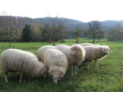 Das Waldschaf Geschichte Das Waldschaf ist eine einst in Süddeutschland weit verbreitete Landschafrasse. Heute ist das Waldschaf nur noch wenigen Menschen bekannt, denn die Tiere sind in ihrem Bestand drastisch zurückgegangen. Derzeit gibt es in Deutschland etwa 1500 Waldschafe im Zuchtbuch. Der Bestand hat sich aus den letzten noch überlebenden Tieren im Bayerischen Wald wieder aufgebaut. Etwa 70 Tiere konnten noch gefunden werden, in denen das bereits ausgestorbene Zaupelschaf noch zu erkennen war. So wurde vor etwa 35 Jahren der Neubeginn des Waldschafes begründet, Ein ordentlicher Anteil der alten Genetik konnte gerettet werden. Einflüsse anderer Rassen sind bei einzelnen Tieren immer wieder in Ansätzen zu erkennen, so weisen z.B. Hängeohren auf den Einfluss des Bergschafes hin. Seit 2005 wird die Archeschäferei als Herdbuchbetrieb geführt und trägt so zum Erhalt der Rasse bei. Beschreibung Das Waldschaf ist ein kleines bis mittelgroßes Schaf mit geradem bis leicht geramstem Nasenprofil und kurzen waagerecht stehenden oder leicht hängenden Ohren. Mutterschafe wiegen ca. 50 bis 60 kg, die Böcke etwa 50 bis 70 kg. Meine Wahl fiel auf das Waldschaf, weil es als robust und unkompliziert, absolut grundfuttertauglich, umgänglich und standorttreu beschrieben wurde. Alle Eigenschaften kann ich bestätigen. Zudem ist das Waldschaf in Süddeutschland heimisch und hat eine Größenklasse, die auch von einer Frau gut alleine zu handhaben ist, z.B. beim Klauen schneiden oder Schafe sortieren. Die Tiere können gehörnt und ungehört vorkommen, wobei die Mehrzahl der männlichen Tiere ausladende Widderhörner entwickelt. Bei den weiblichen Tieren sind die Hörner deutlich kleiner, jedoch auch weit verbreitet. Auf dieser Seite sind - bis auf die kleinen Lämmer - ausschließlich weibliche Waldschafe zu sehen und sowohl Färbung, Behornung und auch die unterschiedlichen Pigmentierungen gut zu erkennen. Das Vlies der Waldschafe ist mischwollig mit dichter wärmender Unterwolle und langem Deckhaar, das an den nassen Tagen als effizienter Regenschutz wirkt. Es gibt heute vor allem helle Waldschafe, doch kommen auch braune, graue und schwarze Tiere vor. Die Archeschäferei bemüht sich, die Farbenvielfalt zu erhalten und so werden inzwischen vermehrt auch dunkle Tiere zur Zucht eingesetzt. Keine leichte Aufgabe, denn es ist immer die genetische Vielfalt auch innerhalb der Rasse zu berücksichtigen, um keine Inzuchtdegeneration zu verursachen. Je weniger Individuen es gibt, desto mehr muss man aufpassen und desto länger dauert es, bis ein Ergebnis zu sehen ist. War zu Beginn unserer Zucht ein Großteil der Herde wollweiß, haben wir inzwischen mehrere dunkle Tiere aus verschiedenen Blutlinien im Betrieb. Gerade beim dunklen Waldschaf wird leider noch oftmals mit Inzucht gearbeitet. Genetisch weiter zu züchten dauert länger, ist aber für das einzelne Tier und die Rasse insgesamt die gesündere Vatiante. Helle und dunkle Wolle eignet sich sehr gut zum Handspinnen und erstellen von robusten Wollwaren. Mehr dazu siehe unter "Wollprojekt". Die Klauen sind hart, die Konstitution insgesamt robust und genügsam. Ansonsten gilt die Aussage von Professor Sambraus: "Das typische Waldschaf ist ein untypisches", denn es kommen sehr viele Woll-, Größen- und Pigment-Variationen vor, so dass die Individuen gut voneinander zu unterschieden sind. Das Waldschaf hat hervorragende Muttereigenschaften und bringt meist Einlinge oder Zwillinge zur Welt, die es problemlos aufzieht. Wiederbelebung Waldschafe sind uns unentbehrliche Helfer bei der Bewirtschaftung von Extensivstandorten geworden und tragen so zum Erhalt einer abwechslungsreichen Kulturlandschaft mit offenen Wiesen und Hanglagen bei. Artenvielfalt und Nutzbarkeit der Streuobstwiesen wird durch die Beweidung gesichert. Jungbaumschutz wird angeraten. Deutschlandweit konnten schon mehrere neue Zuchtgruppen initiiert werden und es besteht eine schöne und konstruktive Zusammenarbeit mit vielen Erhaltungszüchtern.
