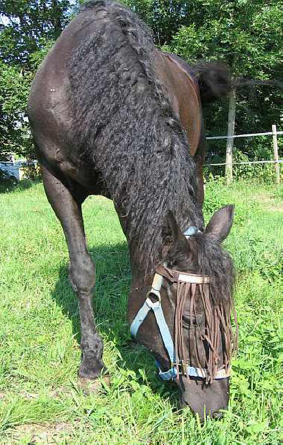 Eine andere sehr ursprüngliche Curly Line geht auf die Züchter Eli Bad Warrior, Slim Berndt und Ernest Hamrich zurück, die diese Pferde ebenfalls liebten und mit ihnen arbeiteten. Die Pferde stehen im Stockhorse Typ, haben ein kräftiges gesundes Fundament und ein menschenfreundliches Gemüt. Diese Linie wird die "warrior" Linie genannt. Einige großartige Curly Horses stammen von dem Hengst Bad Warrior bzw. dessen Mutter Miss Berndt Warrior ab. Miss Berndt Warrior ist Magpies Großmutter, Magpies Mutter Warrior Sue Queen eine Schwester von Bad Warrior - unsere schwarze Elster ist also ein echtes Indianerpony und ihre Vorfahren liefen auch mal bei Sitting Bull und den Crow um die Tipis! Magpie ist auf der Stag Creek Farm in Texas geboren und stammt aus der Zucht von Barbara Carroll.