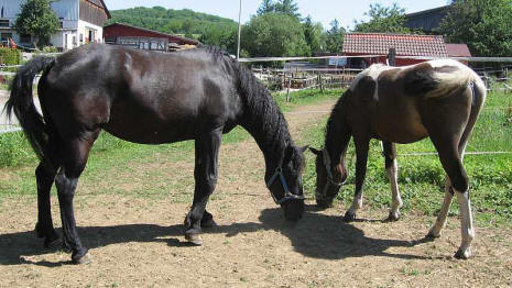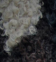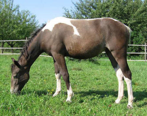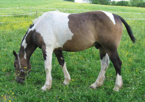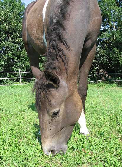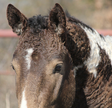 ArcheRanch + Curly Horses Curly Horse (American Bashkir Curly Horse) Curly Horses sind hypoallergene Pferde, d.h. die meisten Pferdehaarallergiker haben mit den Haaren der Curlies keine Probleme. Man sollte sich nicht rein virtuell darauf verlassen, es ist eine individuelle Sache - bei sehr sehr vielen Menschen funktioniert es aber. So auch bei mir! Wie schön, endlich wieder entspannt Pferdeluft schnuppern zu können! Curly Horses haben eine anderes Fell als die üblichen Pferderassen. Auch das Haar an sich hat eine Eiweißstruktur, die dem menschlichen Haar näher ist und so weniger allergieauslösendes Potential besitzt. Das Curly-Sommerfell ist meist glatt wie bei den anderen Pferden, doch beim Winterfell kommen dann wellige Haare oder auch richtige Locken - die curls - zum Vorschein. Die Fohlen sind lockig wie kleine Waldschaflämmer. Auch die Farbvererbung bietet Überraschungen. Hier sind 4 Fellproben zu sehen: Backfire (braun) und Mikade (tobiano), die Eltern von Sparky (palomino). Daneben Peach, eine Mikade Tochter aus einer blue-buckskin Mutter. Curlies verändern mitunter ihre Farbe vom Fohlen- zum Erwachsenenfell recht deutlich, ähnlich mancher Schafrassen. Peach variiert ihre Farbe nun seit 9 Monaten zwischen schwarz und verschiedenen Brauntönen, man weiß noch nicht so ganz, was sie werden will. Auf jede Fall ein lockiges dark-tobiano Mädchen